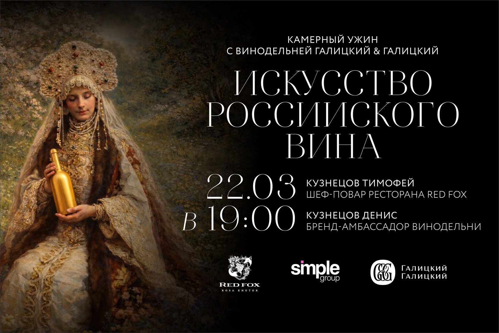 Бренд-амбассадор винодельни Галицкий & Галицкий Денис Кузнецов проведёт гостей по истории и философии хозяйства, расположенного в заповедном терруаре «Красная Горка». В течение вечера он расскажет о характере местного терруара, последних тенденциях виноделия и особенностях создания вин, которые сегодня считаются одними из наиболее заметных в российской винной культуре.